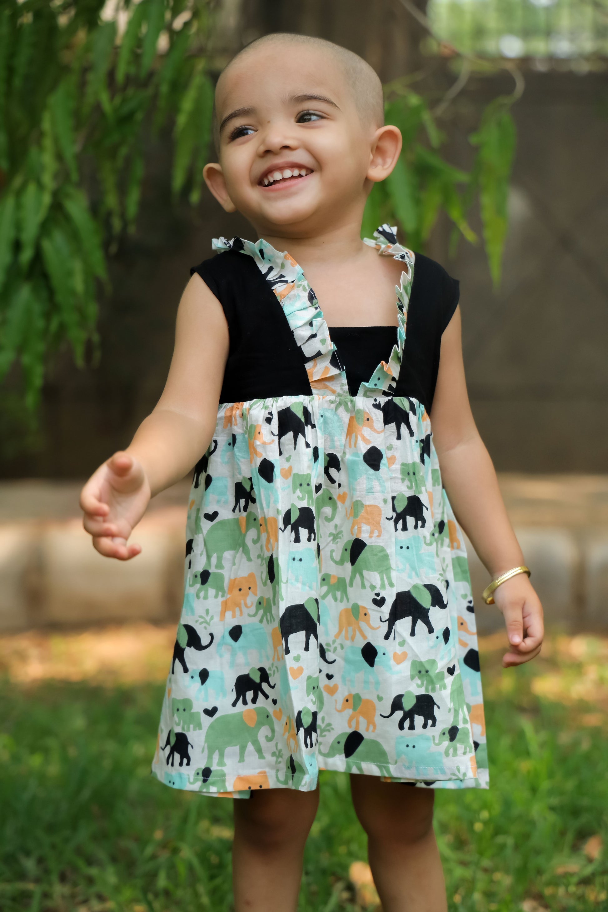 Introducing the Animal Parade Ruffle Frock - a playful and comfortable dress that's perfect for any occasion! With its black color and fun, multicolored color block design, this cotton frock is sure to make a statement. Get ready to stand out in style with this uniquely quirky dress that offers both comfort and fashion.