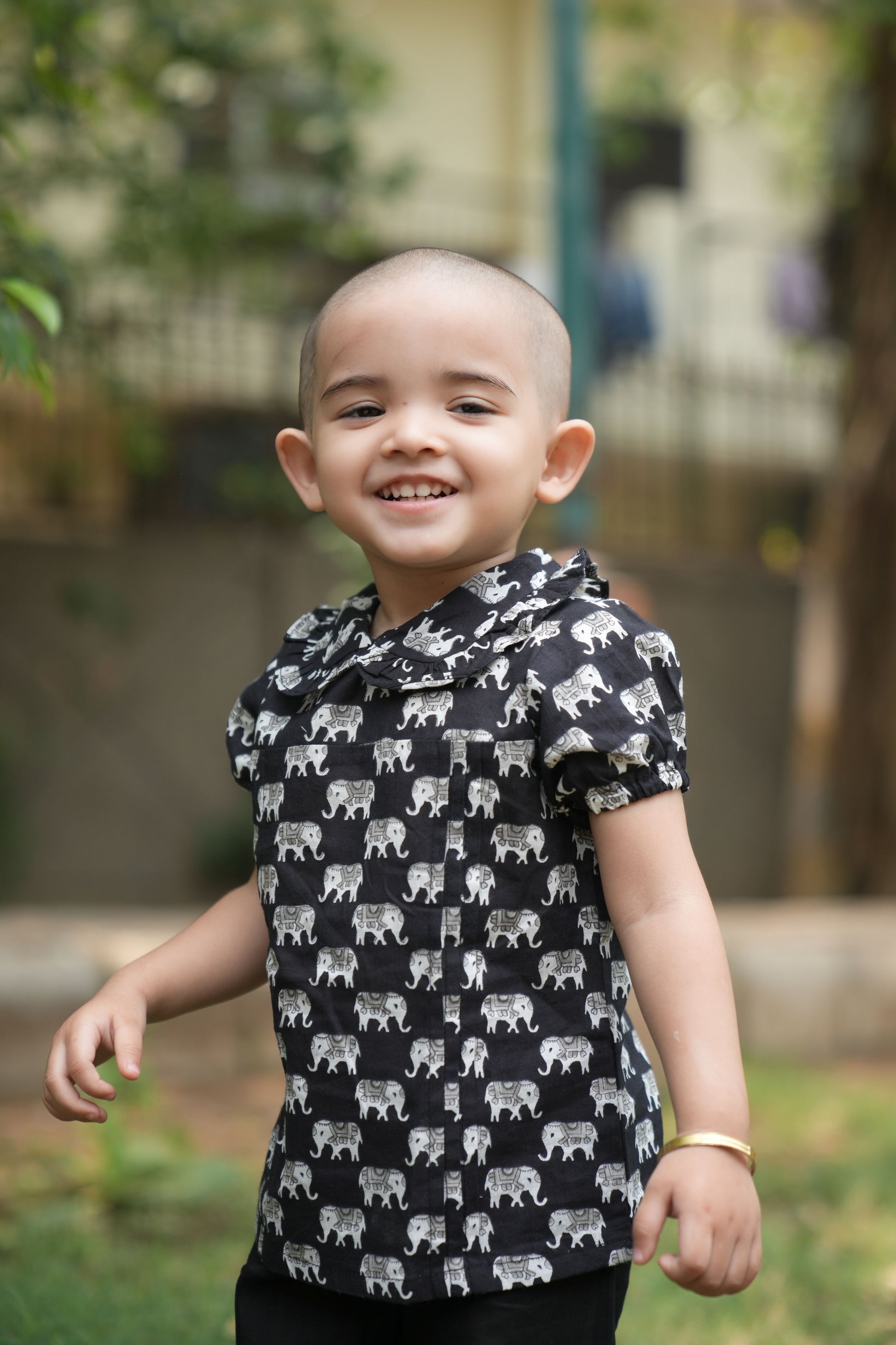 Delicate pintucks, gentle ruffles at the collar, and a soft cotton feel—this top brings together little details that quietly stand out. The playful elephant print adds a light, happy note, making it easy to dress up or down for whatever the day holds. It’s the kind of piece that looks lovely in the moment—and even lovelier in memory.