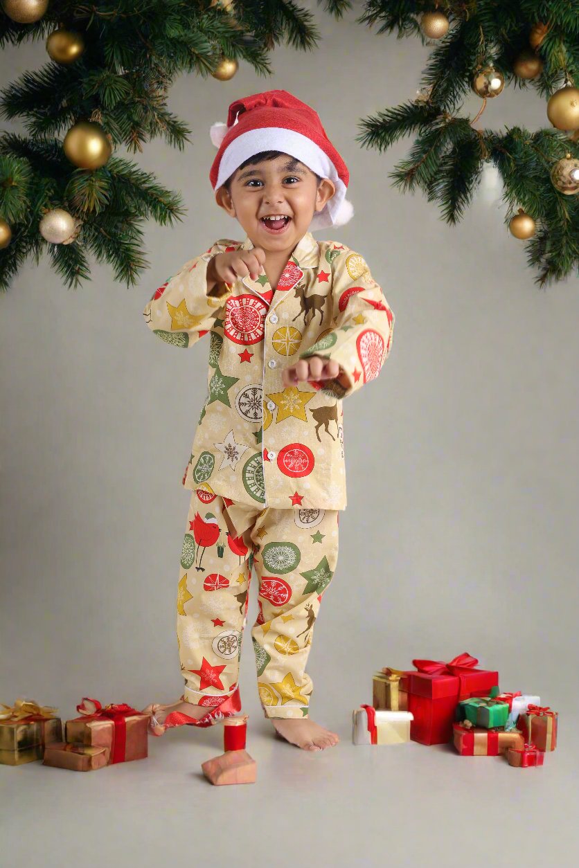 As the holiday season nears, this festive night suit brings cozy cheer to bedtime. Its soft cotton fabric and playful print make it a Christmas-ready essential just in time for those twinkly nights.