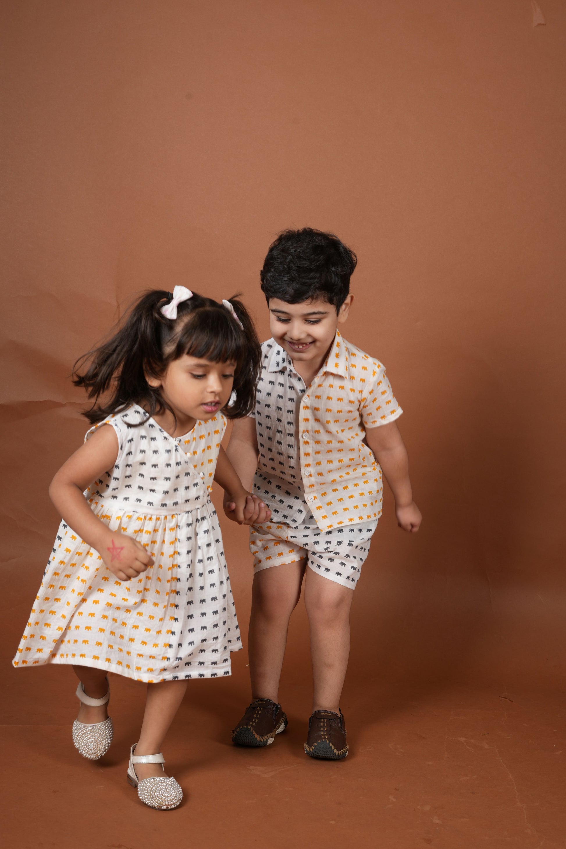 This one’s for the siblings who love to share—just not their toys. A crisp cotton co-ord set for him and a matching frock for her, both in a bold mustard and navy color block with playful elephant prints all over. Made from soft cotton that keeps them cool even when their games get wild. Perfect for weekend outings, family brunches, or just another day of making memories together.